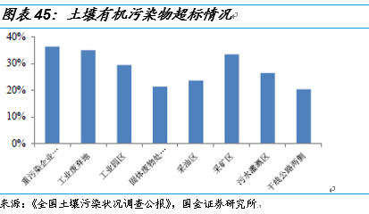 除了耕地污染,我國場地污染情況也很嚴(yán)重。全國土壤污染狀況調(diào)研公報中,重污染企業(yè)、工業(yè)廢棄地和工業(yè)園區(qū)的有機(jī)污染超標(biāo)均達(dá)到和超過了30%。隨著我國城鎮(zhèn)化率的提高和城市建設(shè)面積的擴(kuò)大,很多重污染企業(yè)需要搬離城區(qū),這將產(chǎn)生很大的場地修復(fù)需求。