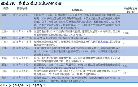 最后,我們通過生態(tài)環(huán)境部網(wǎng)站中的2016年到2017年的中央環(huán)保督察對全國31省區(qū)的督察反饋中發(fā)現(xiàn),垃圾焚燒產(chǎn)能的缺口確實(shí)存在且巨大。在31個省區(qū)中,其中有9個省區(qū)被督察到有生活垃圾無害化能力不足的問題。例如:浙江省督察時發(fā)現(xiàn)全省“十二五”規(guī)劃項(xiàng)目中仍有21座生活垃圾處理設(shè)施未建成投運(yùn),全省生活垃圾處理能力缺口約8000噸/日;山東省全省生活垃圾處理能力缺口超過1.5萬噸/日,80個生活垃圾填埋場中,有48個超負(fù)荷運(yùn)行。