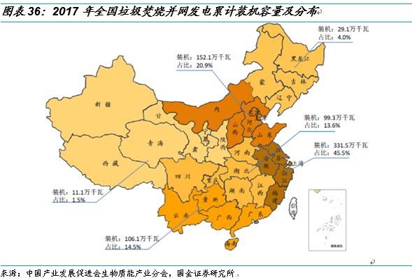 2017年底,我國垃圾焚燒累計并網(wǎng)發(fā)電裝機(jī)容量達(dá)到725.1萬千瓦,約占全國生物質(zhì)并網(wǎng)發(fā)電總裝機(jī)容量的49%。隨著我國城鎮(zhèn)化建設(shè)進(jìn)一步深入,垃圾焚燒發(fā)電項(xiàng)目開發(fā)建設(shè)重點(diǎn)已經(jīng)逐步由大中型城市向新興城鎮(zhèn)轉(zhuǎn)移,“十三五”期間的垃圾焚燒發(fā)電將是生物質(zhì)發(fā)電產(chǎn)業(yè)中的主要增長點(diǎn)。我國的垃圾焚燒發(fā)電項(xiàng)目主要集中在華東和華北地區(qū),尤以經(jīng)濟(jì)相對發(fā)達(dá)的華東地區(qū)的發(fā)展規(guī)模最大,在全國垃圾焚燒發(fā)電裝機(jī)容量中的占比接近一半。目前,垃圾焚燒發(fā)電累計裝機(jī)容量占全國比例最高的四個地區(qū)分別為:江蘇、廣東、浙江和山東,垃圾焚燒發(fā)電項(xiàng)目的建設(shè)與地區(qū)經(jīng)濟(jì)的發(fā)展密切相關(guān)。