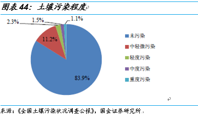 根據(jù)國土資源部數(shù)據(jù),最新全國耕地面積為 20.27 億畝。全國土壤污染狀況調(diào)查公報中,全國土壤總的超標(biāo)率為 16.1%;耕地土壤點(diǎn)位超標(biāo)率為 19.4%,其中輕微、輕度、中度和重度污染點(diǎn)位比例分別為 13.7%、 2.8%、 1.8%和 1.1%,其中重度、中度污染耕地區(qū)域面積高達(dá) 5878 萬畝。