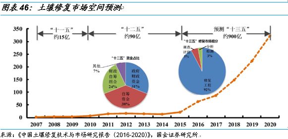 我們預(yù)計目前我國每年的土壤修復(fù)市場在150-200億之間,根據(jù)《中國土壤修復(fù)技術(shù)與市場研究報告(2016-2020)》的預(yù)測,“十三五”期間,我國土壤修復(fù)市場空間將達(dá)到900億,發(fā)展階段將進(jìn)入快速成長期。