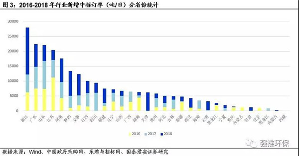 2016-2018年,浙江、廣東、山東、江蘇為新增項(xiàng)目最多的前四個省份,新中標(biāo)項(xiàng)目分別達(dá)到了2.8、2.2、2.2、2萬噸/日的規(guī)模,這還不包括部分未經(jīng)過招標(biāo)程序的擴(kuò)建項(xiàng)目。