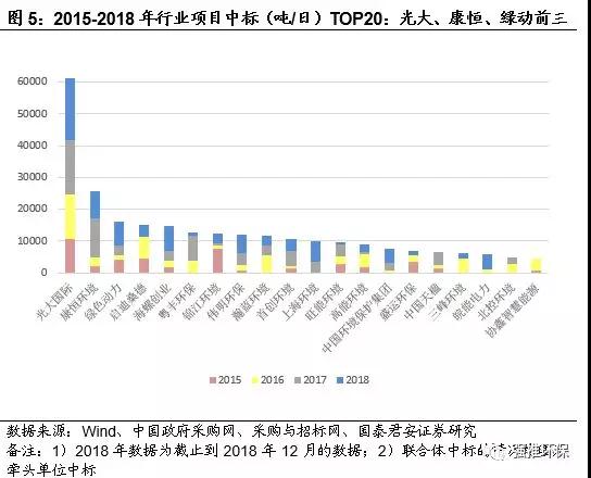 新增中標(biāo)項(xiàng)目向龍頭公司集中。分公司來看,2015-2018年行業(yè)新增項(xiàng)目總產(chǎn)能前三的公司分別為光大國際、康恒環(huán)境、綠色動力,分別占有新增中標(biāo)項(xiàng)目總量的22%、9%、6%。