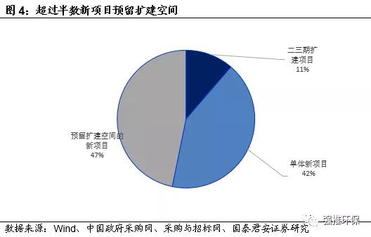 全新項(xiàng)目中,單體項(xiàng)目111個,占比47%;剩余124個項(xiàng)目已預(yù)留二期(三期)擴(kuò)建場地或?yàn)槎冢ㄈ冢U(kuò)建項(xiàng)目,側(cè)面反映項(xiàng)目方已考慮到未來新增處置需求的增長。