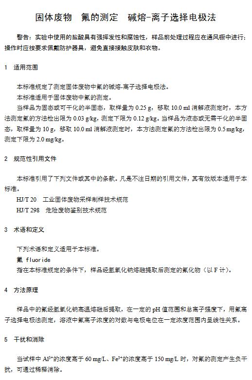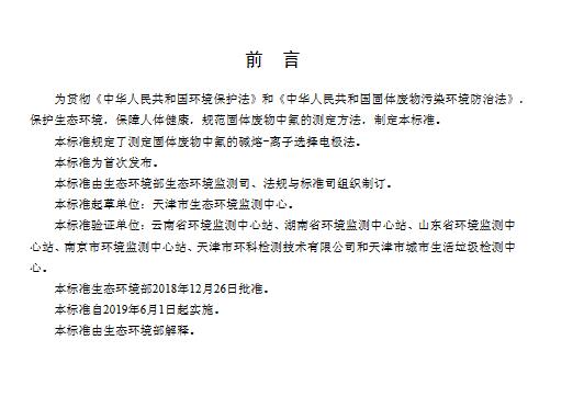 日前生態(tài)環(huán)境部發(fā)布了國家環(huán)境保護標(biāo)準(zhǔn):《固體廢物氟的測定 堿熔-離子選擇電極法》(HJ 999-2018),具體內(nèi)容如下: