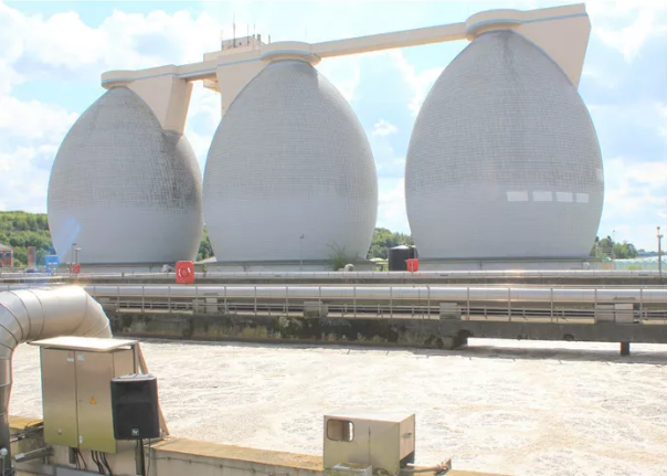 污水在這三個巨型橢圓塔生成沼氣供給焚燒垃圾做燃?xì)?/p>