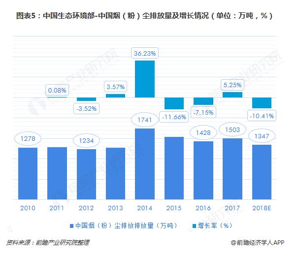 煙(粉)塵排放量在2014年達到1741萬噸的排放高峰后,近年來整體下滑。2017年的排放量在1503萬噸左右。