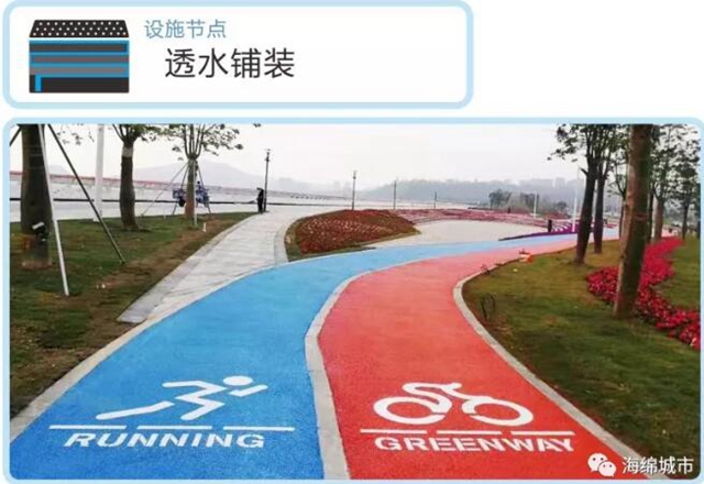 項目利用紅藍兩條濱水自行車道和綠道作為串聯(lián),將整個項目各分散部分完整地連接起來。整條透水海綿路面,利用經(jīng)特殊工藝處理的納米材料對膠凝材料進行改性,改善了無機聚合物材料的物相組成和微觀結(jié)構(gòu),使之具有高吸水率、高透水率、高強度、抗?jié)B、抗凍、抗沖、耐磨、耐化學腐蝕等顯著優(yōu)點,能對雨水進行初步凈化。同時,路面保護層采用水性環(huán)保耐磨材料,同時添加納米光觸媒材料,在提高耐磨性的同時,可有效降解汽車尾氣,改善空氣質(zhì)量。