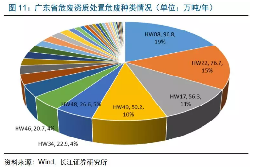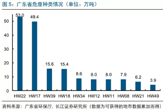 廣東省危廢種類中前5位的HW08(含油污泥,96.8萬噸,占總資質(zhì)的20%)/HW22(含銅廢物,76.7萬噸,占總資質(zhì)的15%)/HW17(表面處理污泥,56.3萬噸,占總資質(zhì)的11%)/HW49(其他廢物,50.2萬噸,占總資質(zhì)的10%)/HW48(有色金屬冶煉廢物,26.6萬噸,占總資質(zhì)的5%)合計(jì)占總資質(zhì)61%,危廢資質(zhì)種類集中度高。