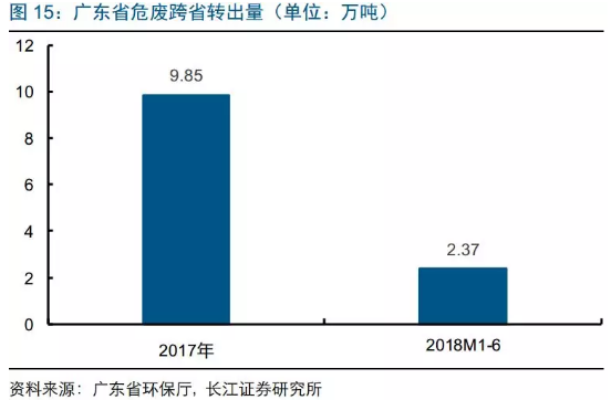 2017年廣東省跨省轉(zhuǎn)出危廢量9.85萬噸(占廣東省產(chǎn)危量的4.2%),2018年前6個(gè)月跨省轉(zhuǎn)出2.37萬噸。從接受省份來看,湖南、安徽、江西占比較高,三省合計(jì)接收廣東危廢6.76萬噸,占廣東轉(zhuǎn)出危廢量的68.6%。