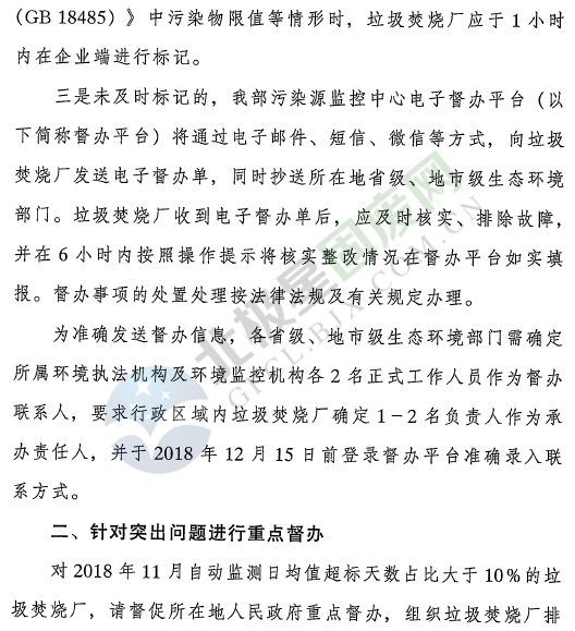 日前生態(tài)環(huán)境部辦公廳下發(fā)了加急通知:《關(guān)于實(shí)施生活垃圾焚燒發(fā)電廠煙氣排放自動(dòng)監(jiān)控電子督辦等有關(guān)事項(xiàng)的通知》,通知提到,即日起(發(fā)文之日起)生態(tài)環(huán)境部將對(duì)生活垃圾焚燒發(fā)電廠實(shí)施超標(biāo)異常電子督辦。各地應(yīng)督促垃圾焚燒廠對(duì)焚燒系統(tǒng)公開和自動(dòng)監(jiān)測(cè)異常情況進(jìn)行主動(dòng)標(biāo)記。針對(duì)突出問題進(jìn)行重點(diǎn)督辦,對(duì)2018年11月自動(dòng)監(jiān)測(cè)日均值超標(biāo)天數(shù)占比大于10%的垃圾焚燒發(fā)電廠,請(qǐng)督促所在地人民政府重點(diǎn)督辦,組織垃圾焚燒廠排查超標(biāo)原因、制定并落實(shí)整改措施。