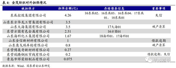 18年金茂自身主營業(yè)務(wù)承壓的情況下,巨額對外擔(dān)保的風(fēng)險暴露,導(dǎo)致企業(yè)流動性緊張,最終出現(xiàn)違約。截至2018年6月末,金茂紡織對外擔(dān)保余額為19.33億元,占當(dāng)期期末凈資產(chǎn)的19.23%,擔(dān)保規(guī)模較大。被擔(dān)保企業(yè)主要是位于山東省東營市的民營企業(yè),區(qū)域較為集中,且所處行業(yè)集中在周期性較強的有色金屬、化工等行業(yè),在宏觀經(jīng)濟增速放緩的背景下,代償風(fēng)險大,金茂紡織的對外擔(dān)保有極高的風(fēng)險傳導(dǎo)性。被擔(dān)保企業(yè)山東大海集團有限公司和奧戈瑞車輪集團有限公司的信用風(fēng)險已經(jīng)暴露:奧戈瑞于今年7月10日宣布進入破產(chǎn)重組階段,公司為其擔(dān)保0.8億;11月26日,山東大海向東營法院申請重整,金茂紡織為其擔(dān)保3.5億元。金茂紡織在尚且自顧不暇的情況下,又受巨額對外擔(dān)保的拖累,資金鏈斷裂,企業(yè)無法正常經(jīng)營運轉(zhuǎn),于在11月26日宣告破產(chǎn)重整。