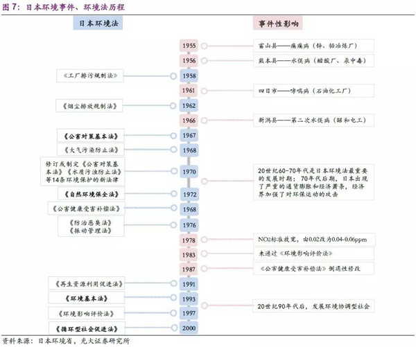 20世紀(jì)50-70年代,日本快速實(shí)現(xiàn)工業(yè)化,經(jīng)濟(jì)成就舉世矚目,但期間各類公害事件頻發(fā),成為了尖銳的社會(huì)和政治問題。在此背景下,以1967年《公害對(duì)策基本法》為核心的環(huán)保法律體系應(yīng)運(yùn)而生,日本環(huán)保產(chǎn)業(yè)開始了上升周期。雖然環(huán)保政策在80年代初經(jīng)濟(jì)下行時(shí)稍有反復(fù),但也僅是過程中的擾動(dòng)。隨著工業(yè)化及城鎮(zhèn)化達(dá)到一定階段,日本末端治污需求逐漸減弱,2000年以《循環(huán)型社會(huì)促進(jìn)法》為核心的法律體系應(yīng)運(yùn)而生,日本大力推進(jìn)循環(huán)經(jīng)濟(jì)的國策,以減輕自身由于資源匱乏的限制,實(shí)現(xiàn)了法律體系由“被動(dòng)”到“主動(dòng)”的過程。
