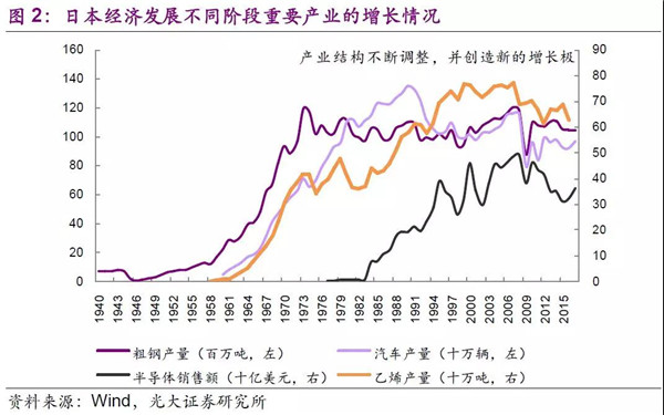 20世紀(jì)70年代起,尼克松沖擊、兩次石油危機(jī)以及廣場協(xié)議,致日本經(jīng)濟(jì)面臨較大的考驗(yàn)。1974年是日本經(jīng)濟(jì)第一個(gè)重要的分界點(diǎn),對(duì)于資源貧乏和市場狹窄的日本來說,期初人口及原材料廉價(jià)的優(yōu)勢已經(jīng)消失,只有通過產(chǎn)業(yè)結(jié)構(gòu)的升級(jí),發(fā)展節(jié)能和精細(xì)化高附加值的產(chǎn)品,才能實(shí)現(xiàn)日本企業(yè)競爭力進(jìn)一步提升。在此期間,日本汽車、半導(dǎo)體產(chǎn)業(yè)的騰飛便是一個(gè)很好的例子,新的增長極的出現(xiàn),也將石油危機(jī)、資源約束的影響降到較低的水平。