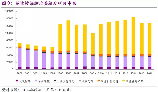以日本環(huán)境省統(tǒng)計(jì)口徑,環(huán)境污染防治包括:大氣污染防治、污水處理、土壤及水質(zhì)凈化、噪聲防治、環(huán)境管理支持、環(huán)境友好產(chǎn)品。