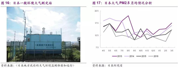 環(huán)境質(zhì)量監(jiān)測方面,以大氣監(jiān)測為例,日本分為一般環(huán)境大氣測定站、汽車尾氣測量站:2016年,日本全國范圍內(nèi)二氧化氮測定站共1636個(gè)(1243+393,一般+尾氣,下同)、SPM測定站共1684個(gè)(1296+388)、光化學(xué)氧化劑OX測定站共1172個(gè)(1143+29)、二氧化硫測定站共1008個(gè)(957+51)、一氧化碳測定站共285個(gè)(57+228)、PM2.5測定站共1008個(gè)(785+223)。