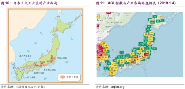 日本大氣污染始于工業(yè)化進(jìn)程,產(chǎn)業(yè)密度和布局很關(guān)鍵,AQI指數(shù)也與工業(yè)化進(jìn)程相關(guān)性較強(qiáng)。日本主要工業(yè)區(qū)集中在太平洋沿岸的帶狀地帶:即京濱(東京——橫濱)、名古屋(名古屋為中心)、阪神(大阪——神戶)、瀨戶內(nèi)海(瀨戶內(nèi)海沿岸)和北九州五大工業(yè)區(qū)。