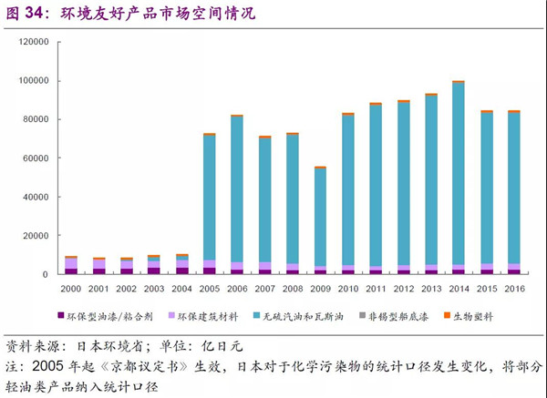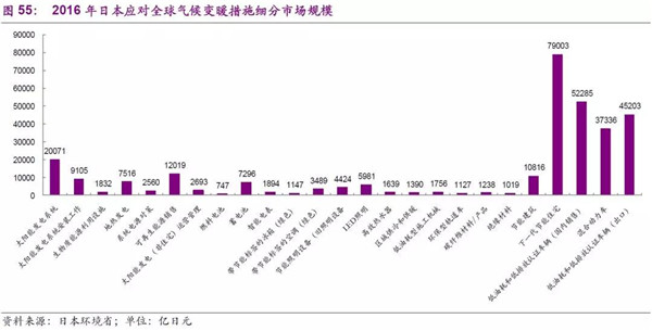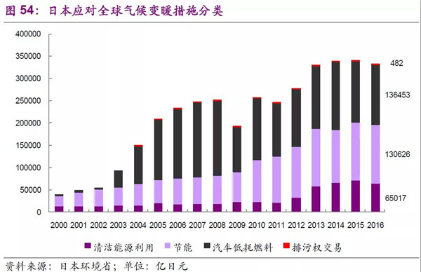 在日本應(yīng)對(duì)全球氣候變暖措施分類上,主要有清潔能源利用、節(jié)能、汽車低耗燃料等具體措施,2016年整體的市場空間可以達(dá)33萬億日元(日本環(huán)境省數(shù)據(jù))。具體細(xì)分來看,以2016年為例,節(jié)能建筑、低油耗低排放及混合動(dòng)力車輛、太陽能產(chǎn)業(yè)、蓄電池、節(jié)能照明設(shè)施等是未來重要的發(fā)展方向。