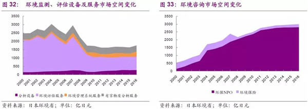 在環(huán)境支持管理科目分為很多細(xì)項(xiàng),如環(huán)境監(jiān)測、評(píng)估設(shè)備及服務(wù)和環(huán)境咨詢市場。日本基本已經(jīng)建成較為全面的環(huán)境監(jiān)測體系,因此近些年來設(shè)備需求相對(duì)穩(wěn)定,2016年為291億日元;更多的市場需求以服務(wù)為主,其中2016年,環(huán)境評(píng)估為792億日元市場空間,環(huán)境管理系統(tǒng)服務(wù)為313億日元市場空間,有害物質(zhì)分析服務(wù)為353億日元市場空間。