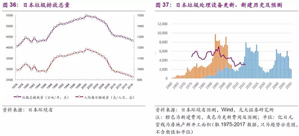 整體上看,2000年后隨著循環(huán)經(jīng)濟(jì)制度的推行,疊加經(jīng)濟(jì)周期和產(chǎn)業(yè)結(jié)構(gòu)的不斷變化,日本垃圾的總排放量、人均排放量均呈現(xiàn)減少趨勢,而垃圾處理設(shè)備周期也和工業(yè)化、城鎮(zhèn)化及房地產(chǎn)周期密切相關(guān)。