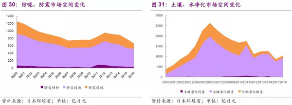 日本的防噪、防震措施分為設(shè)備與材料市場,2016年總市場空間為762億日元,其中防音設(shè)施、防震設(shè)施占比較高,分別為492、233億日元;日本的土壤和水質(zhì)凈化分為設(shè)備及服務(wù)市場,設(shè)備需求較弱,主要是以服務(wù)方式體現(xiàn),2016年土壤凈化服務(wù)市場為942億日元,河湖凈化服務(wù)為95億日元。