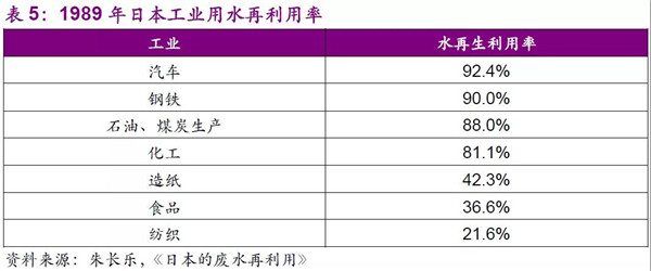 日本工業(yè)用水消耗量隨工業(yè)化發(fā)展迅速提升,1989年工業(yè)水消耗量達(dá)到1.44億立方米/日,耗水大戶為化工、鋼鐵、造紙,占總量約70%左右。1965年工業(yè)水的再利用率僅為36%,日本從改革生產(chǎn)工藝入手,盡量采用資源利用率高、污染物排放量少的先進(jìn)工藝,最大限度地利用水資源,使得再利用率在1975年達(dá)到67%、1989年進(jìn)一步達(dá)到76%;行業(yè)方面,汽車、石油、煤炭工業(yè)和化學(xué)工業(yè)都具有高水再生利用率,而紡織、食品、造紙工業(yè)的水再生利用率較低,原因在于前者冷卻、空調(diào)等用水易于回收,而后者常為洗滌用水,較難以處理。(朱長樂,《日本的廢水再利用》)