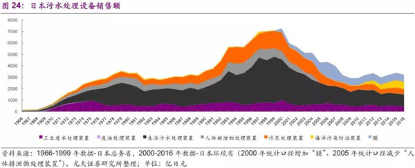 從污水處理市場空間分析:工業(yè)污水設(shè)備的需求體現(xiàn)了工業(yè)化以及法規(guī)發(fā)展過程,日本的工業(yè)污水處理市場在70年代達(dá)到一個(gè)高峰,后期相對(duì)平穩(wěn);而生活污水處理設(shè)備及市政設(shè)施建設(shè)則與城鎮(zhèn)化、房地產(chǎn)周期以及法規(guī)發(fā)展過程相關(guān),日本的生活污水處理市場則在20世紀(jì)90年代中后期達(dá)到高峰;海洋污染防治在2011年開始受重視,設(shè)備需求在逐步提升的過程中。