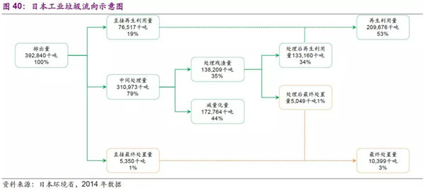 日本工業(yè)垃圾處理更為深刻的踐行了循環(huán)型社會(huì)路線,根據(jù)2014年日本環(huán)境省數(shù)據(jù),工業(yè)垃圾排放量為3.92億噸,資源化、減量化、最終處置量分別為2.10、1.72、0.10億噸,其中資源化占比高達(dá)53.6%。