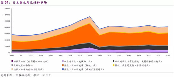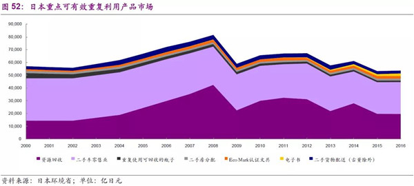 2016年,再生材料整體市場為8.47萬億日元,其中鋼鐵、有色、造紙回收分別為3.80、1.34、1.77萬億日元;可有效重復(fù)利用產(chǎn)品總市場為5.44萬億日元,其中二手車零售和一般資源回收2.50、1.99萬億日元。