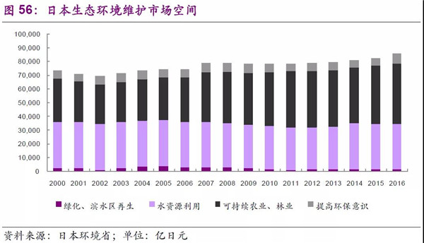 日本的生態(tài)維護(hù)市場主要是面向自然資源的維護(hù),主要體現(xiàn)在水資源利用和可持續(xù)發(fā)展農(nóng)業(yè)和林業(yè)。市場空間方面,2016年綠化、濱水區(qū)再生為1781億日元、水資源利用3.3萬億日元、可持續(xù)農(nóng)業(yè)及林業(yè)為4.4萬億日元、提高環(huán)保意識(shí)措施為6793億日元。