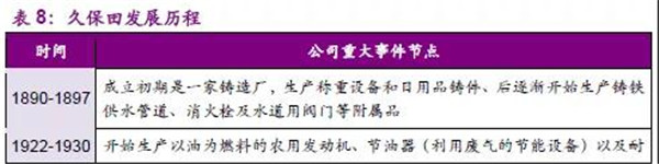 久保田株式會(huì)社成立于1890年,從生產(chǎn)鑄件開始,通過夯實(shí)的技術(shù)不斷拓展市場,隨后發(fā)展到生產(chǎn)發(fā)動(dòng)機(jī)、農(nóng)用機(jī)械、環(huán)境設(shè)施等。公司已經(jīng)成為全球農(nóng)業(yè)機(jī)械龍頭并將業(yè)務(wù)拓展至海外多個(gè)國家,其中水稻插秧機(jī)和聯(lián)合收割機(jī)產(chǎn)品世界市占率排名第一。同時(shí),公司已在二十余個(gè)國家成立生產(chǎn)及銷售公司,國際銷售收入占到了50%左右。環(huán)保業(yè)務(wù)方面,公司從成立開始,就開始提供從上游到下游的水處理解決方案,從工程、采購、建設(shè)到維護(hù),以保證水質(zhì)安全無憂。