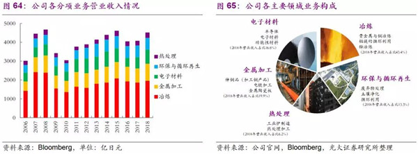 公司從1884年秋田縣小坂礦山起步,逐步發(fā)展到從金屬的生產(chǎn)開始到高附加價(jià)值產(chǎn)品的制造、以及廢棄物的處理及循環(huán)利用,開展著特有的循環(huán)型事業(yè)活動(dòng),這也契合了當(dāng)前日本綠色發(fā)展的產(chǎn)業(yè)要求。公司目前共有五大服務(wù)領(lǐng)域:環(huán)保與循環(huán)再生、冶煉、電子材料、金屬加工、以及熱處理,2018年?duì)I業(yè)收入達(dá)4548億日元,各業(yè)務(wù)營業(yè)收入占比相對(duì)穩(wěn)定,其發(fā)家的冶煉業(yè)務(wù)營業(yè)收入占比常年保持在40%以上。