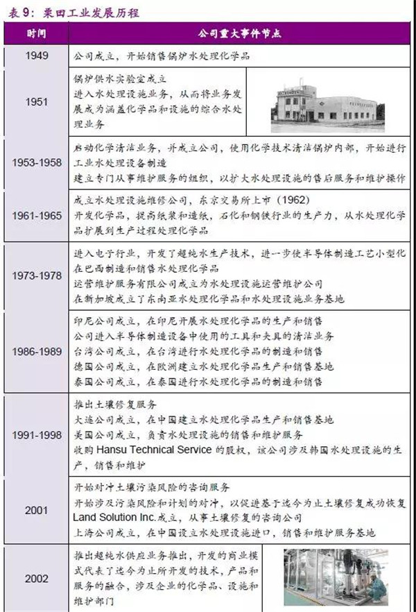 公司起步于鍋爐清洗化學(xué)品銷售,在成立早期雖經(jīng)歷一定坎坷,但最終公司的技術(shù)和產(chǎn)品逐漸被市場認(rèn)可,成為市場的主導(dǎo)產(chǎn)品。伴隨日本工業(yè)化進(jìn)程發(fā)展,1953年后公司的業(yè)務(wù)范圍不僅局限于化學(xué)品產(chǎn)品,也開始進(jìn)入設(shè)備領(lǐng)域,尤其是在水處理設(shè)備市場,如:離子交換樹脂、水軟化及純水設(shè)備是公司具有核心競爭力的產(chǎn)品。公司通過不斷學(xué)習(xí)并獲取過濾設(shè)備、流量控制等多項(xiàng)技術(shù),逐步確立了鍋爐水供應(yīng)的市場地位。
