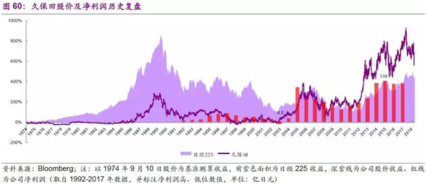 我們對(duì)公司1974-2018年的股價(jià)及凈利潤進(jìn)行了復(fù)盤。公司作為的全球農(nóng)業(yè)機(jī)械和環(huán)境領(lǐng)域設(shè)備制造商,受經(jīng)濟(jì)周期性影響較為顯著,具有典型的周期股屬性。公司上市后的早期階段持續(xù)跑輸大盤,在20世紀(jì)80年代末資產(chǎn)泡沫階段,表現(xiàn)也較為低迷;2003-2007年全球經(jīng)濟(jì)繁榮,尤其是中國和北美的業(yè)務(wù)帶動(dòng)公司業(yè)務(wù)進(jìn)一步發(fā)展,公司業(yè)績穩(wěn)步提升(2005年的業(yè)績提升主要系收到了586億日元養(yǎng)老金替代計(jì)劃的政府補(bǔ)助),股票開始獲得超額收益;隨后受次貸危機(jī)影響,公司股價(jià)隨業(yè)績同步走低,直到2012年后日元貶值至出口轉(zhuǎn)好,疊加全球經(jīng)濟(jì)回暖北美和東南亞銷售回暖,公司在2013-2014年的業(yè)績才顯著轉(zhuǎn)好;此后公司股價(jià)隨日本股市整體上漲,表現(xiàn)優(yōu)異至今。