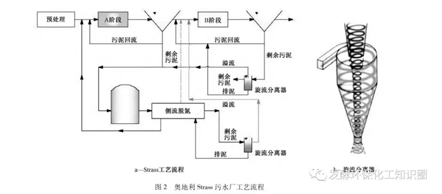 斯特拉斯污水處理廠以主流傳統(tǒng)工藝( AB法)與側(cè)流新型脫氮工藝( 厭氧氨氧化) 相結(jié)合的方式,運(yùn)行工藝如圖2a所示。可知: 污水經(jīng)過預(yù)處理進(jìn)入A段吸附( adsorption) 去除有機(jī)物,可有效防止過高的有機(jī)物對(duì)厭氧氨氧化菌的抑制。之后污水進(jìn)入B段生物降解過程( biodegradation) ,即采用一體式厭氧氨氧化工藝脫氮。在A段吸附了大量有機(jī)物的污泥,經(jīng)過排泥、剩余污泥濃縮、厭氧消化和脫水等過程后,產(chǎn)生的污泥厭氧消化液和污泥脫水液氨氮濃度較高,采用側(cè)流厭氧氨氧化DEMON工藝脫氮。側(cè)流部分通過旋流分離器( 圖2b) 分離絮體( 主要是AOB)和顆粒污泥( 主要AnAOB) ,從而富集厭氧氨氧化菌。在主流工藝中,除了傳統(tǒng)方式的污泥回流外,還需要回流測流工藝的污泥實(shí)現(xiàn)對(duì)AOB和AnAOB生物強(qiáng)化。除此之外,該工藝還將部分污泥消化液定期回流至B階段,進(jìn)行氨氮負(fù)荷的調(diào)控。