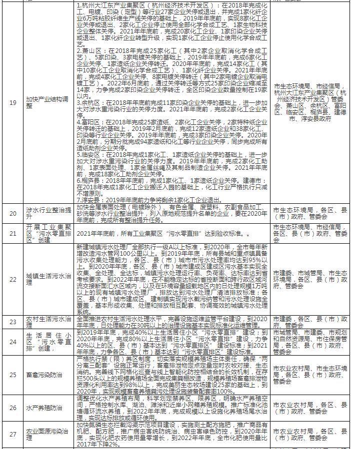 2.強化工業(yè)污染治理。制定涉水重污染行業(yè)“杭州標準”,到2020年,完成化工、印染、造紙等涉水重污染行業(yè)地方排放標準的制定。結(jié)合傳統(tǒng)產(chǎn)業(yè)改造提升行動,加快錢塘江流域化工、印染、造紙等企業(yè)或產(chǎn)能的搬遷改造,到2022年完成369家企業(yè)關(guān)停轉(zhuǎn)遷。加快金屬表面處理(電鍍除外)、有色金屬、廢塑料、農(nóng)副食品加工、砂洗等涉水行業(yè)整治提升,列入原地規(guī)范提升名單的企業(yè),要在2020年年底前完成所有整治提升任務(wù)。開展工業(yè)集聚區(qū)“污水零直排區(qū)”創(chuàng)建,2021年年底前,所有工業(yè)集聚區(qū)“污水零直排”達到驗收標準。加快建立工業(yè)集聚區(qū)截污納管、雨污分流、排水許可證發(fā)放等管理的“一園一檔”。在全面完成重點排污單位自動監(jiān)控設(shè)施安裝和聯(lián)網(wǎng)的基礎(chǔ)上,加強自動監(jiān)控設(shè)施運行管理,進一步強化監(jiān)督執(zhí)法。