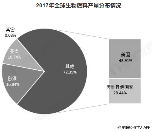 從2017年全球各區(qū)域生物燃料產(chǎn)量分布來看,主要集中在以美國為主的美洲國家,2017年達到了6085.9萬噸當油量,全球占比達72.35%。其中美國2017年生物燃料產(chǎn)量為3693.6萬噸當油量,占全球的43.91%,占美洲的60.69%;2017年歐洲國家生物燃料產(chǎn)量1416.7萬噸當油量,占全球的16.84%。此外亞太地區(qū)為903.1萬噸當油量,占比10.74%。