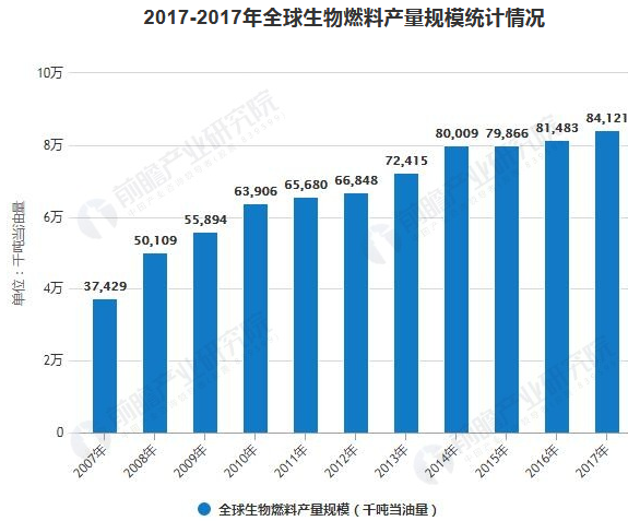 隨著全球大規(guī)模、大范圍的發(fā)展生物質(zhì)能發(fā)電,生物燃料生物燃料產(chǎn)量規(guī)模也實現(xiàn)的迅速的增長。數(shù)據(jù)顯示,2007年全球生物燃料產(chǎn)量為3742.9萬噸當油量,至2017年上升至8412.1萬噸當油量,2008-2017年復合增長率達8.43%。