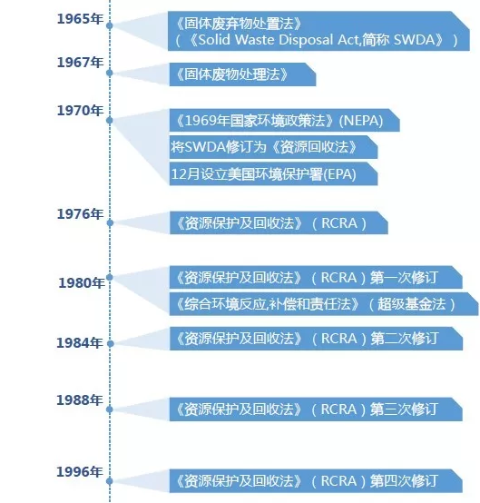 從70年代起,美國以《國家環(huán)境政策法》為基礎(chǔ),成立了國家環(huán)境保護(hù)署,制定了《固體廢物處理法》、《資源保護(hù)與回收利用法》、《危險(xiǎn)廢物管理?xiàng)l例》、《綜合環(huán)境反應(yīng),補(bǔ)償和責(zé)任法》等諸多法律,經(jīng)過多年的發(fā)展,美國環(huán)衛(wèi)行業(yè)相關(guān)法律體系已經(jīng)非常完善。其發(fā)展脈絡(luò)如下圖所示: