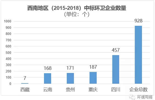 備注:西南地區(qū)(2015-2018)中標(biāo)環(huán)衛(wèi)企業(yè)總數(shù)為928個(gè),五省市區(qū)的中標(biāo)企業(yè)數(shù)量之和大于928的原因在于:有少量規(guī)模較大的環(huán)衛(wèi)企業(yè)是跨省份投標(biāo),出現(xiàn)重復(fù)統(tǒng)計(jì)。