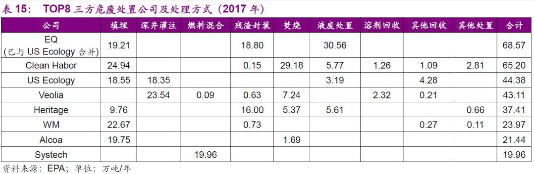 (2)第三方處理比例較低。在1990年后,政府對危廢的監(jiān)管進一步趨嚴,單純的通過第三方處置對于有大量危廢產(chǎn)出的企業(yè)來說成本過高,加上危廢處理技術(shù)的進一步成熟,促使眾多大型化工企業(yè)采用自行處理危廢的方式消納危廢產(chǎn)出。從2001年起,美國危廢的場外處理量(Waste received from off-Site,即接收從場外運送進處理廠內(nèi)的危廢,基本等同于第三方處置量)常年低于20%,在危廢產(chǎn)量基本穩(wěn)定的情況下,第三方處置危廢企業(yè)可以分到的蛋糕其實十分有限,這也激發(fā)了危廢處置企業(yè)開拓新業(yè)務(wù)的需求。