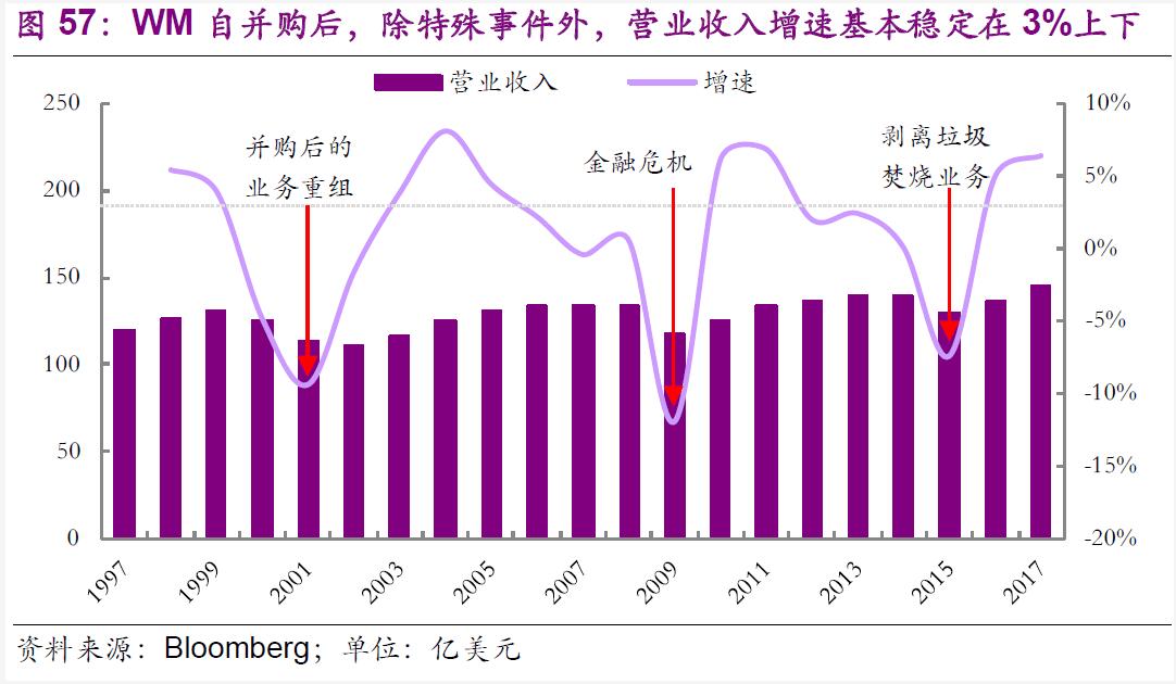 外因內(nèi)策聯(lián)動,助力公司發(fā)展。外因方面,美國居民消費支出增長帶動固廢產(chǎn)生量從1960年的560萬噸提升到1990年的2.08億噸;1970年前后,《固體廢物處置法》等法規(guī)的出臺催化行業(yè)向規(guī)范化標(biāo)準(zhǔn)化成長;固廢處置的成熟技術(shù)發(fā)展為固廢綜合管理提供有力支撐,而環(huán)保意識的逐漸完善則成為行業(yè)資源化、精細化處理轉(zhuǎn)型的決定性因素,帶動美國垃圾填埋處理占比從1960年的90%以上下降至2010年的54%,回收利用處理占比則從1960年的6%提升到2010年的34%。內(nèi)策方面,在對的時機采取對的兼并收購策略,先是幫助WM在行業(yè)高速發(fā)展階段通過140余次收購搶占市場份額,成為行業(yè)龍頭;在改變公司歷史的1998年的WM/UW合并后,又通過數(shù)十次大體量的核心業(yè)務(wù)收購進一步穩(wěn)固公司市場份額,以及數(shù)十次專業(yè)化新業(yè)務(wù)的收購?fù)瓿尚屡d業(yè)務(wù)開拓轉(zhuǎn)型,帶動公司實現(xiàn)新一輪騰飛。