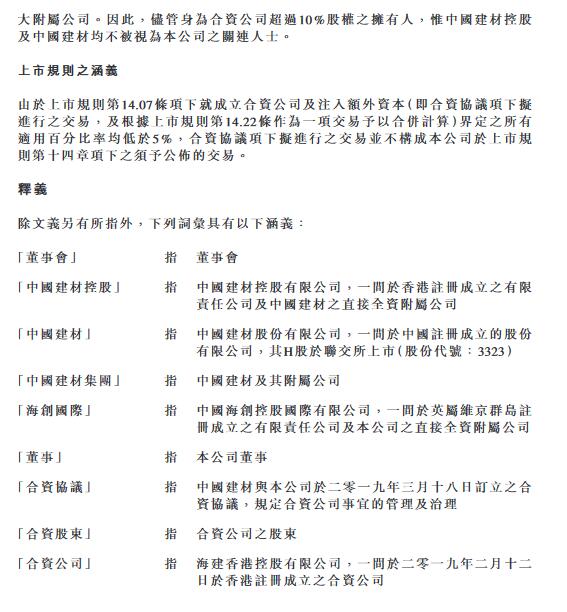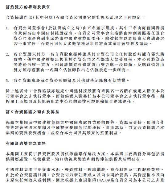 根據(jù)合資協(xié)議,合資協(xié)議訂約雙方合作目標(biāo)及范圍為由合資公司于中國成立一間有限責(zé)任公司(即外商獨資企業(yè)),主要目的為于中國從事固廢處置業(yè)務(wù)。外商獨資企業(yè)將全權(quán)負(fù)責(zé)投資(不論以控股、參股或其他投資方式)、經(jīng)營及管理中國建材從事水泥相關(guān)業(yè)務(wù)的若干附屬公司(關(guān)聯(lián)水泥企業(yè))現(xiàn)有及未來的固廢處置業(yè)務(wù),預(yù)計規(guī)劃處置總產(chǎn)能不少于300萬噸/年。