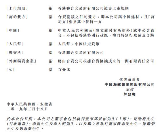 海螺創(chuàng)業(yè)公告,于2019年2月12日,一間合資公司于香港注冊成立,該公司乃由海創(chuàng)國際(公司全資附屬公司)與中國建材控股(中國建材全資附屬公司)共同設(shè)立。于2019年3月18日,公司與中國建材訂立合資協(xié)議,內(nèi)容有關(guān)合資公司事宜的管理及治理以及公司與中國建材之間的合作范圍。