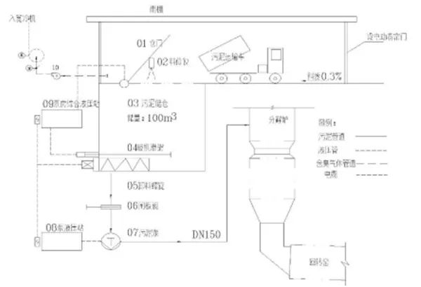 整個污泥輸送系統由污泥儲存系統、泵送系統及PLC自動控制系統組成。工藝流程詳見下圖。