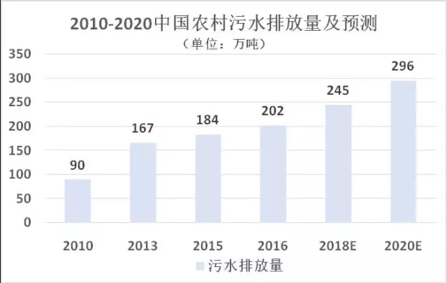 目前,農(nóng)村水污染物排放量占全國水污染物排放量50%以上,根據(jù)前瞻產(chǎn)業(yè)研究院發(fā)布的《2017-2022年中國農(nóng)村污水處理行業(yè)發(fā)展前景預測與投資戰(zhàn)略規(guī)劃分析報告》顯示:2016年我國農(nóng)村污水排放量達到202萬噸,2010-2016年復合增速超過10%,預測到2020年可達到近300萬噸,由此可見農(nóng)村污水排放量體量驚人,我國農(nóng)村污水處理的市場需求十分劇烈!