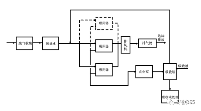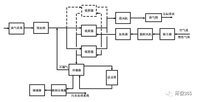 當(dāng)廢氣中的有機(jī)物具有回收價值時,可根據(jù)情況選擇采用水蒸氣再生、熱氣流(空氣或惰性氣體)再生或降壓解吸再生工藝。脫附后產(chǎn)生的高濃度氣體可根據(jù)情況選擇采用降溫冷凝或液體吸收工藝對有機(jī)物進(jìn)行回收。