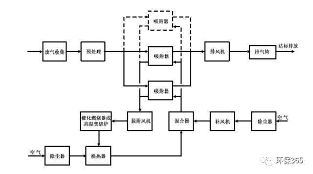 當(dāng)廢氣中的有機(jī)物不宜回收時,宜采用熱氣流再生工藝。脫附產(chǎn)生的高濃度有機(jī)氣體采用催化燃燒或高溫焚燒工藝進(jìn)行銷毀。