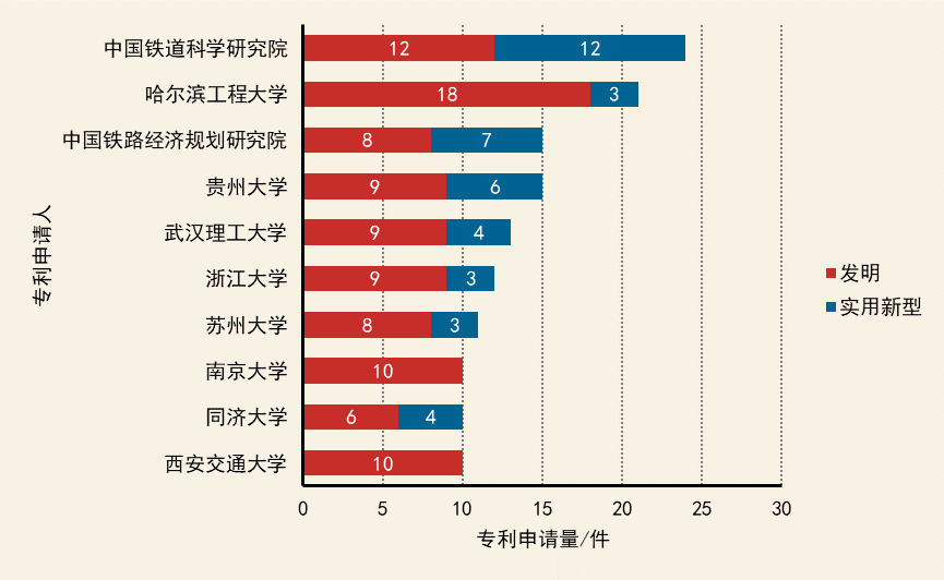 中國(guó)國(guó)內(nèi)院校在該技術(shù)領(lǐng)域的專(zhuān)利申請(qǐng)量偏少。排在前三位的高校/科研院所分別是中國(guó)鐵道科學(xué)研究院、哈爾濱工程大學(xué)、中國(guó)鐵路經(jīng)濟(jì)規(guī)劃研究院。