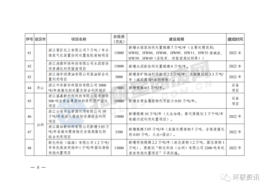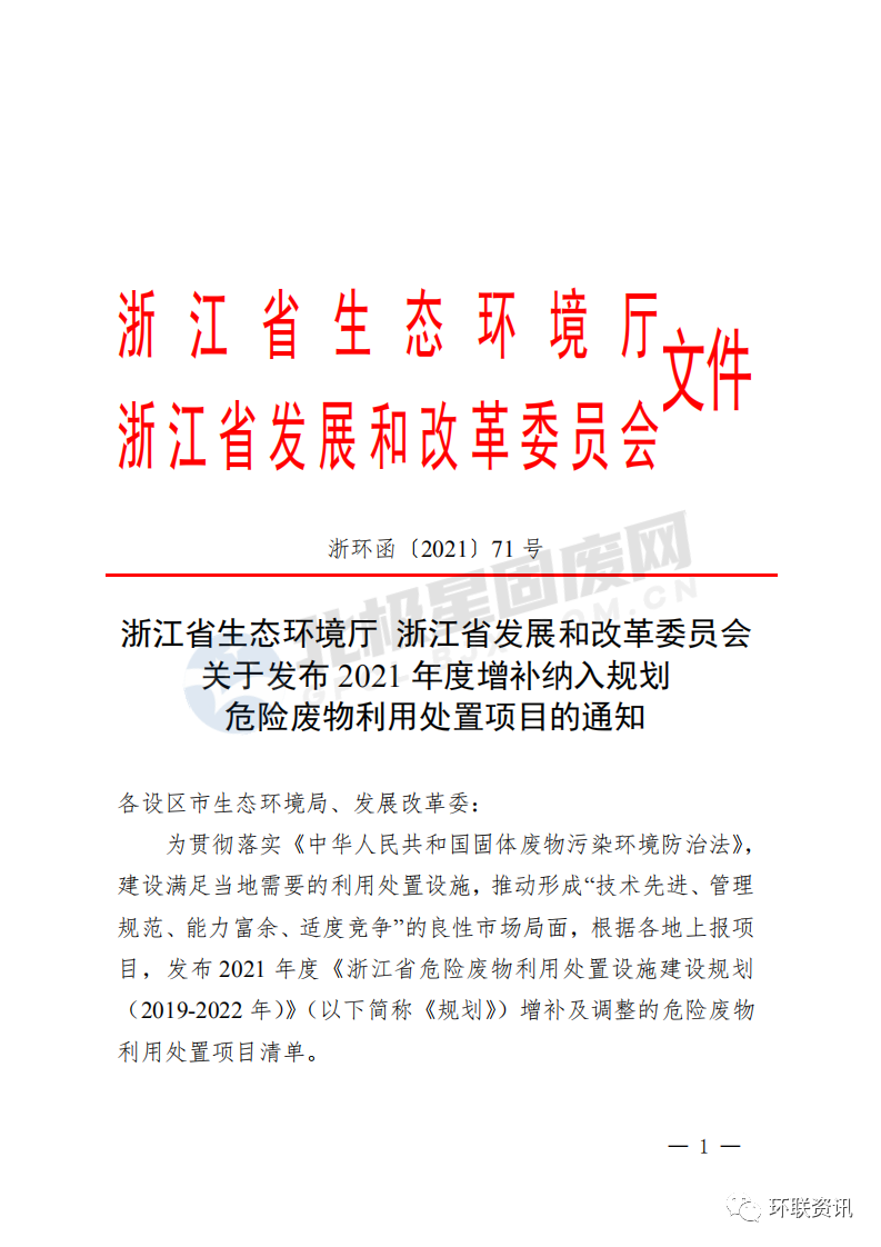 浙江省生態(tài)環(huán)境廳 浙江省發(fā)展和改革委員會(huì)關(guān)于發(fā)布2021年度增補(bǔ)納入規(guī)劃危險(xiǎn)廢物利用處置項(xiàng)目的通知各設(shè)區(qū)市生態(tài)環(huán)境局、發(fā)展改革委:為貫徹落實(shí)《中華人民共和國(guó)固體廢物污染環(huán)境防治法》,建設(shè)滿足當(dāng)?shù)匦枰睦锰幹迷O(shè)施,推動(dòng)形成“技術(shù)先進(jìn)、管理規(guī)范、能力富余、適度競(jìng)爭(zhēng)”的良性市場(chǎng)局面,根據(jù)各地上報(bào)項(xiàng)目,發(fā)布2021年度《浙江省危險(xiǎn)廢物利用處置設(shè)施建設(shè)規(guī)劃(2019-2022年)》(以下簡(jiǎn)稱(chēng)《規(guī)劃》)增補(bǔ)及調(diào)整的危險(xiǎn)廢物利用處置項(xiàng)目清單。